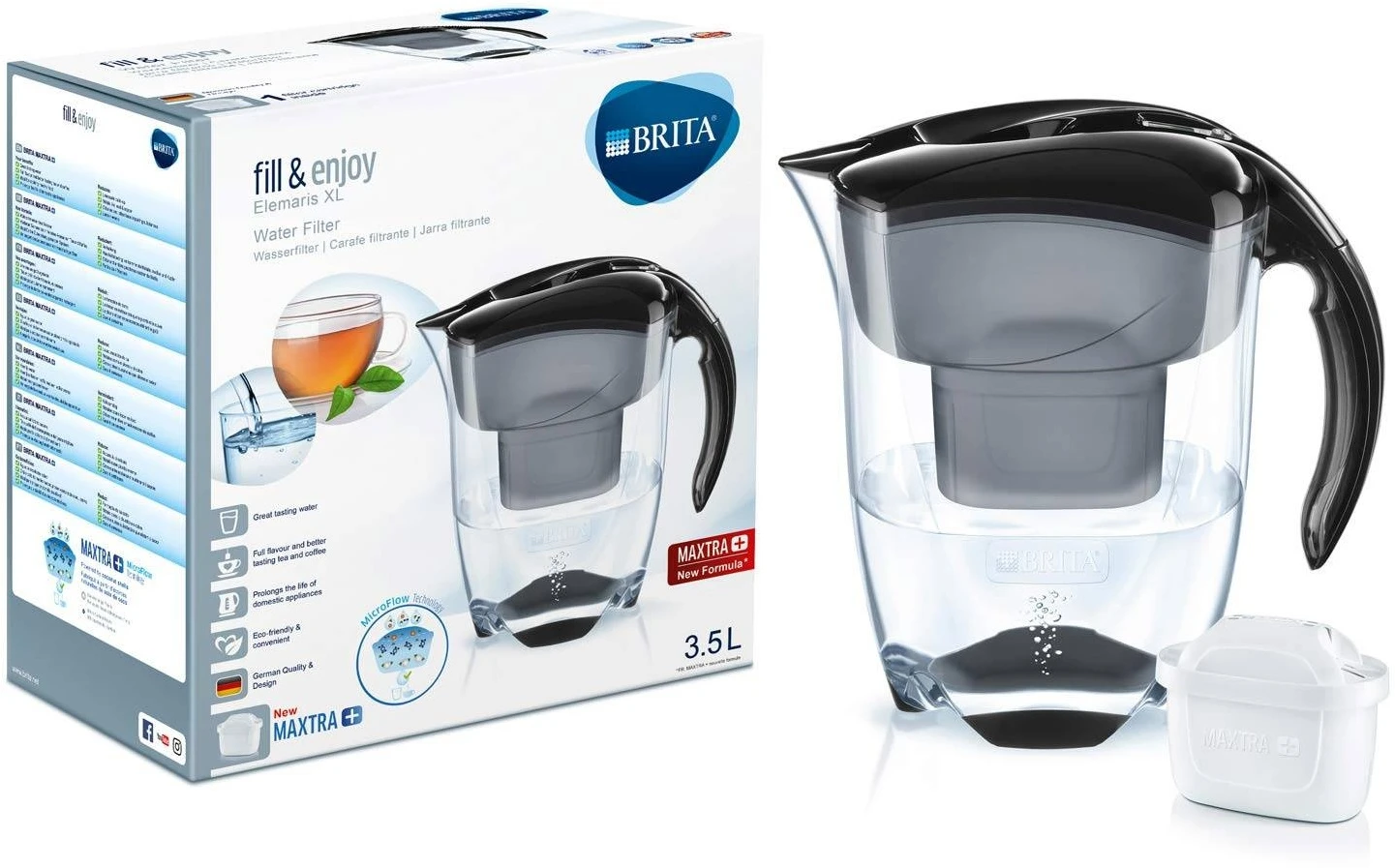 Premium, extra large BRITA water filter jug with new formula MAXTRA+ filter technology and advanced ‘Meter’ cartridge life measurement technology.