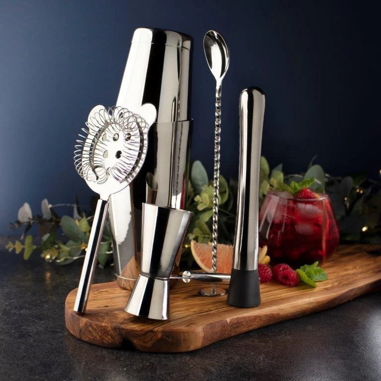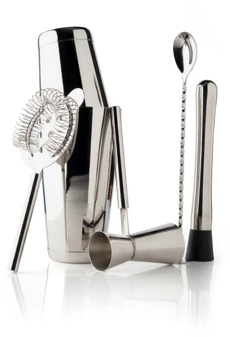 - A handy home cocktail bar set including 2 part “Boston” style shaker, strainer, mixing & layering spoon, muddler & double jigger.